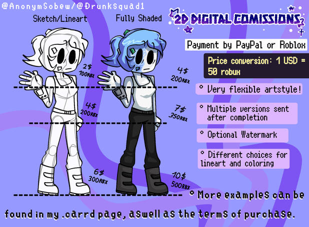 CONDITIONS (2D DIGITAL): • Send a clear image of the character you want me to draw, a ref sheet would be great! But I can try working with simpler images. • You're allowed to multiple changes depending on the process of drawing: ~5 changes for sketch. ~4 changes for lineart, ~2 changes for coloring and render, (More changes than the ones offered increase the price of the commission by 5%) • Each additional detailed prop or character includes and extra cost of the base comission price: ~+15% for detailed props, ~+30% for characters, • Try to be as specific as you can for a better result, you can send references for poses, backgrounds and anything else you consider important.PAYMENT AND METHODS: • Paypal (In Dollars/USD) • Robux (Transaction will be done by gamepasses/clothing) • Payment will be sent 60% in advance, I prioritize works with greater advances or fully paid. I will NOT work in the comission until this advance is received. • You can cancel the commission if the process of making it hasn't started yet. • You CAN NOT request refunds.• ADDITIONAL QUESTIONS YOU MIGHT HAVE WILL BE ANSWERED BY ME IN PRIVATE MESSAGES!